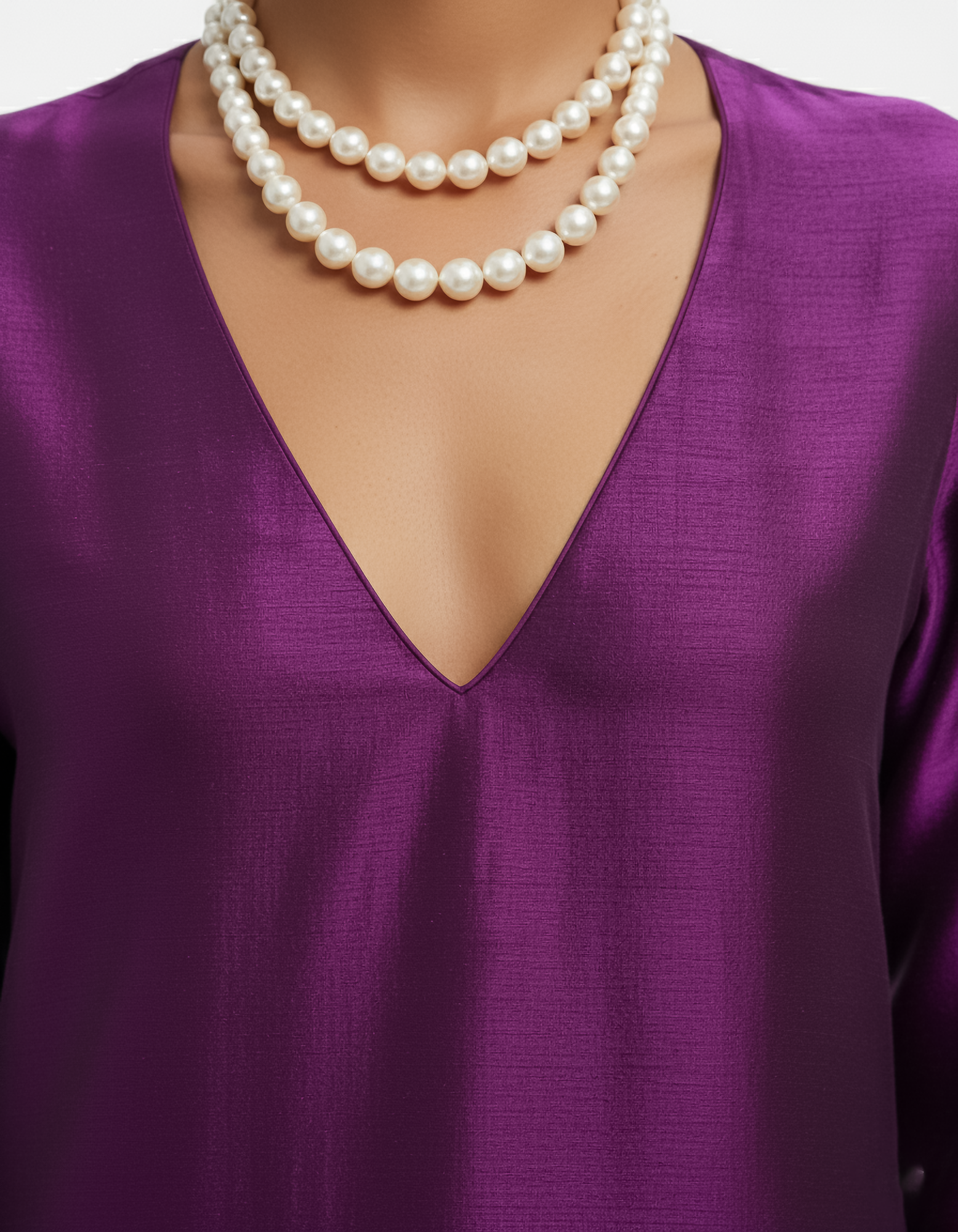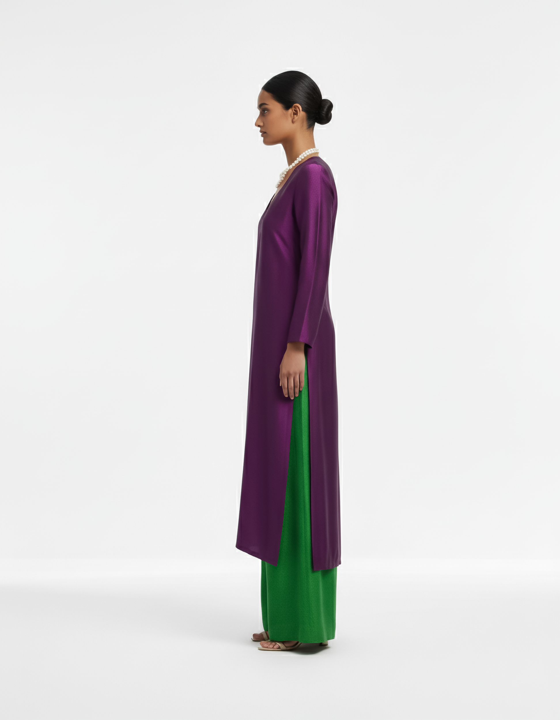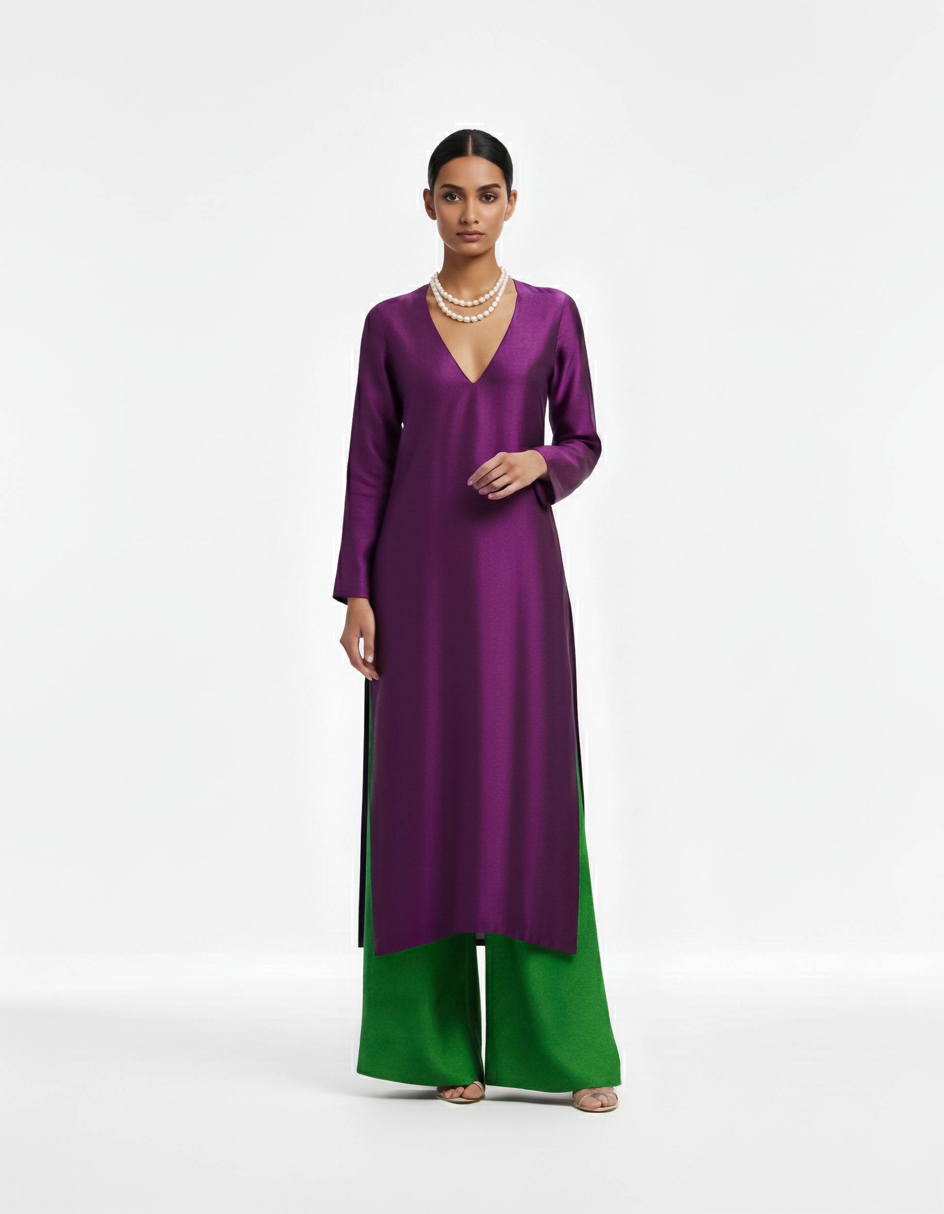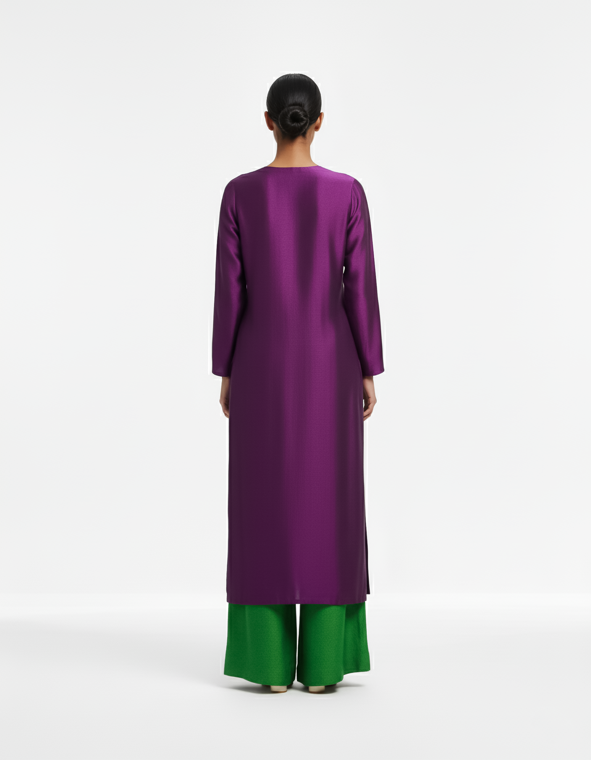 The Pants: Complementing the rich purple is a pair of wide-leg pants in a lively and contrasting lush green. Also crafted from fine Raw Silk, these pants provide a bold visual statement and exceptional comfort, creating a harmonious and eye-catching color block effect.