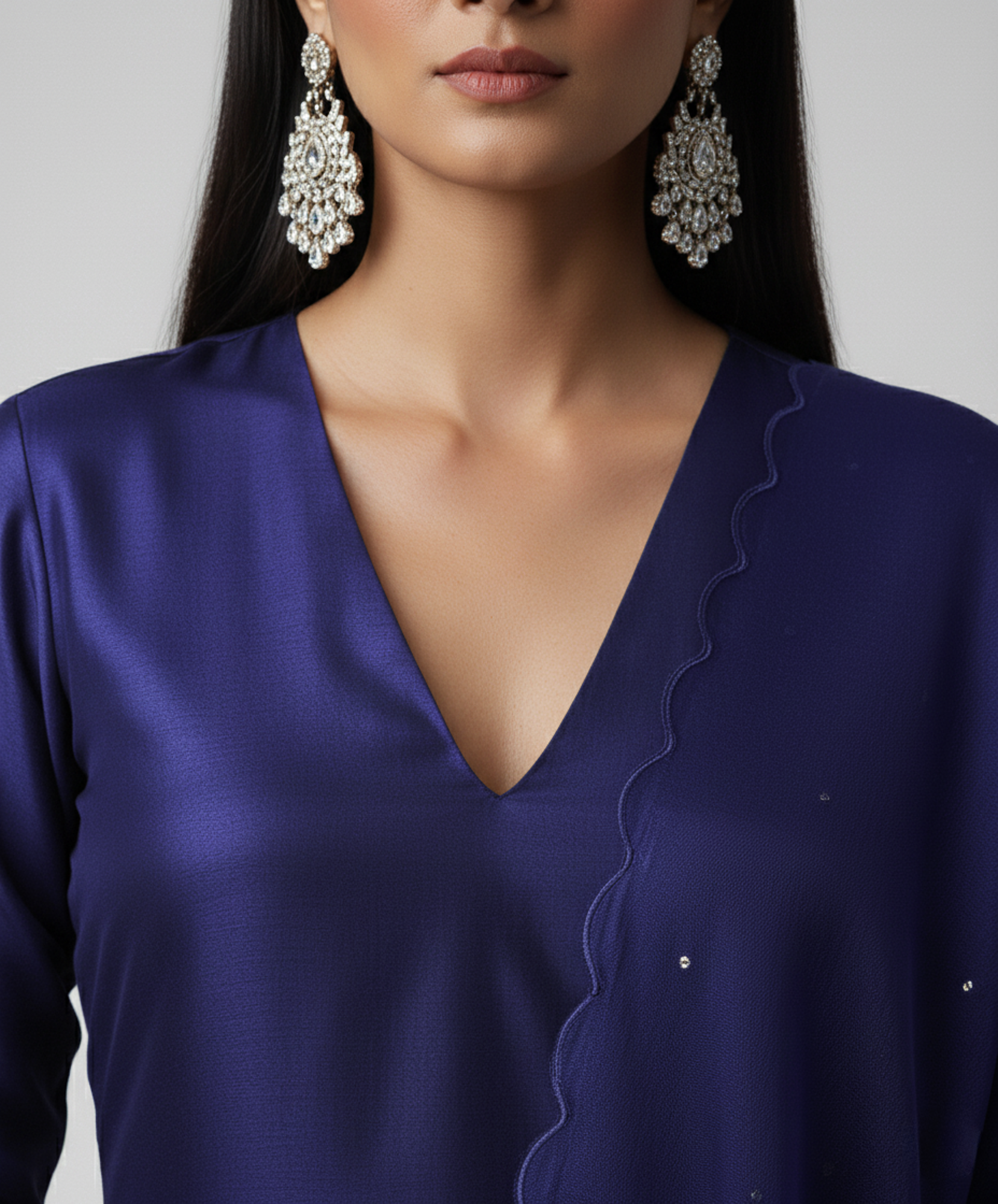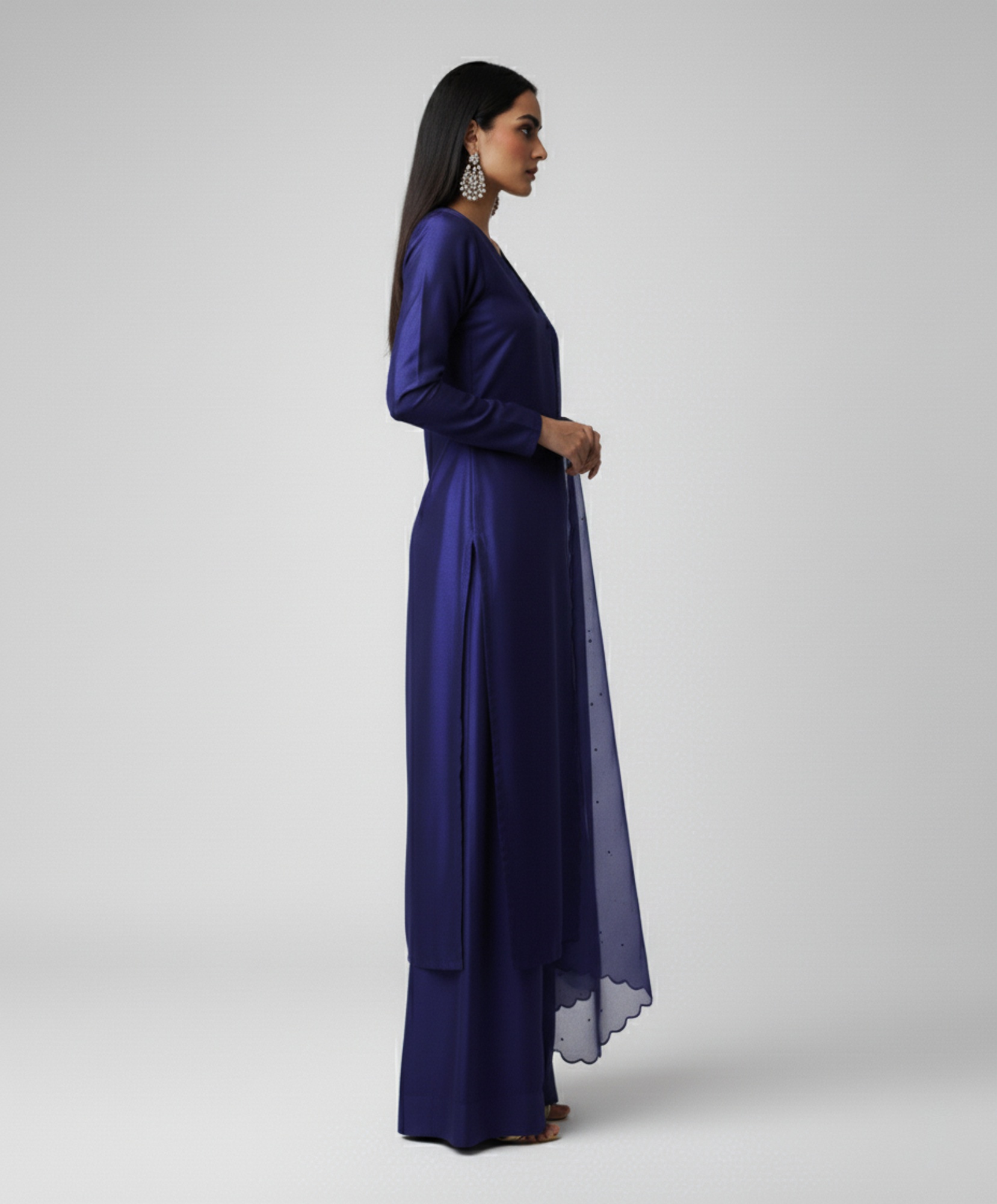 Pants: Flared wide-leg pants that fall beautifully, offering a comfortable fit and a dramatic, flowing movement. They maintain the same luxurious silk finish as the kurta.