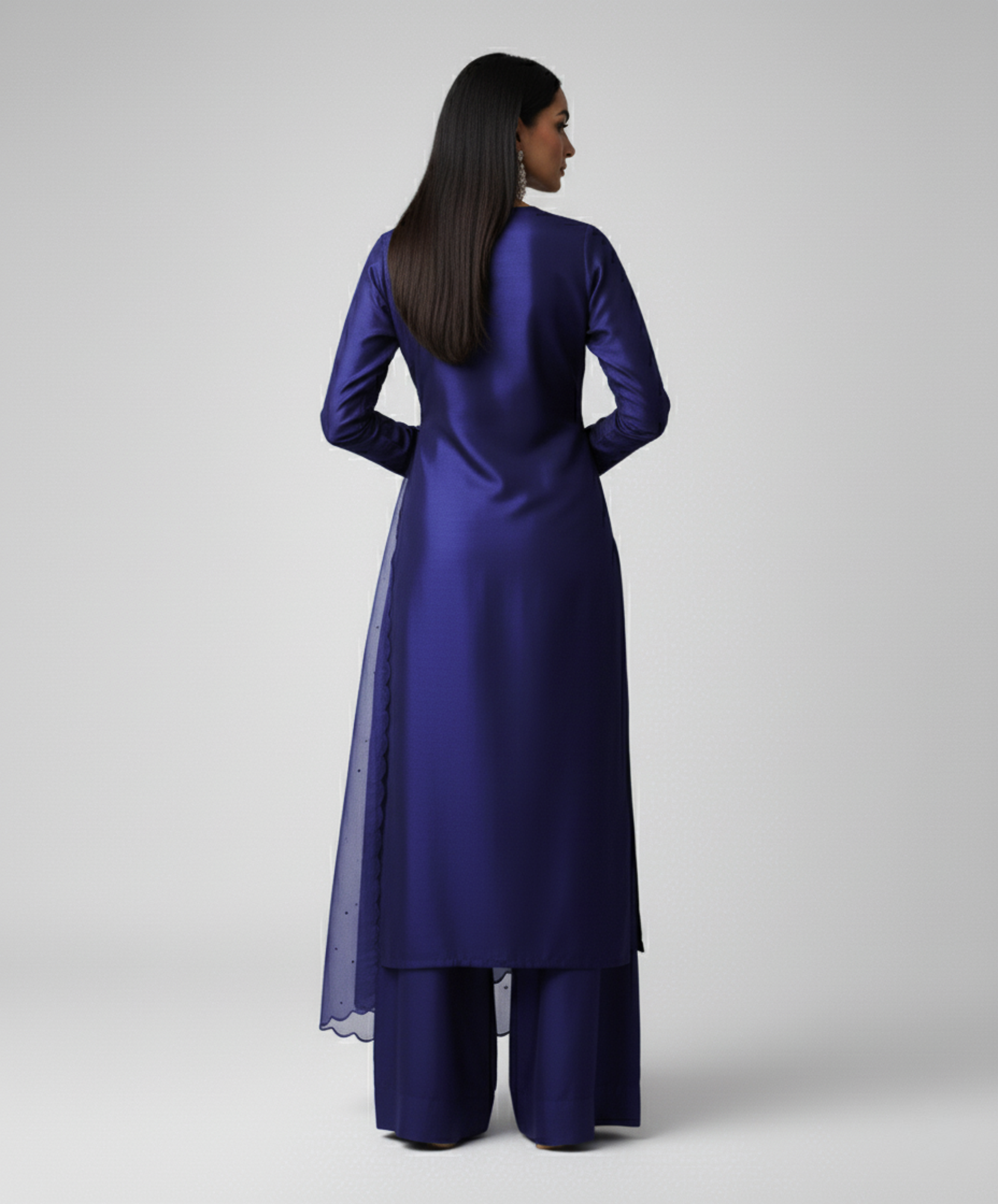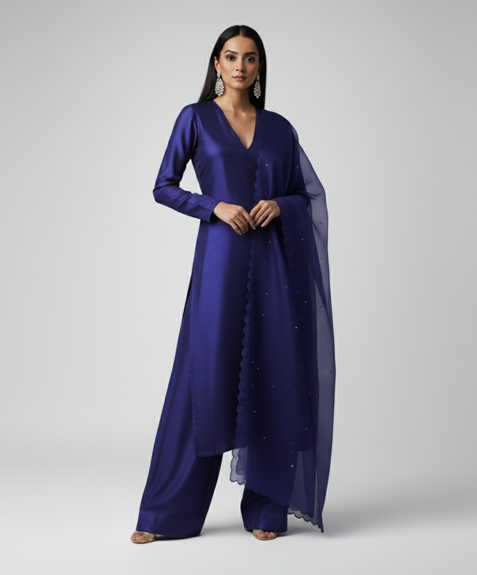 Fabric: Pure Silk for the kurta and pants, providing a rich drape and a subtle, high-sheen finish. The dupatta is a delicate organza sheer fabric for effortless grace.