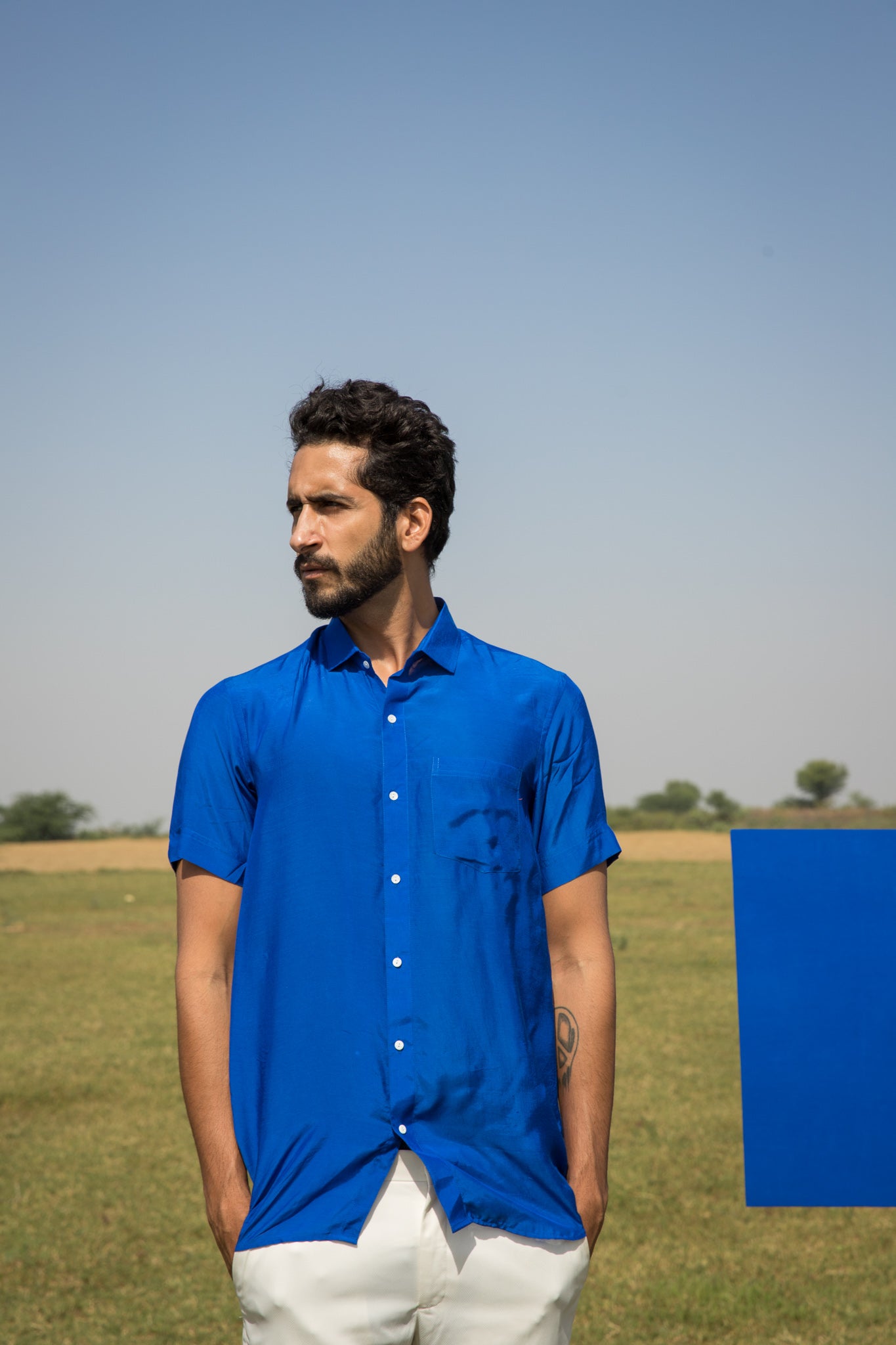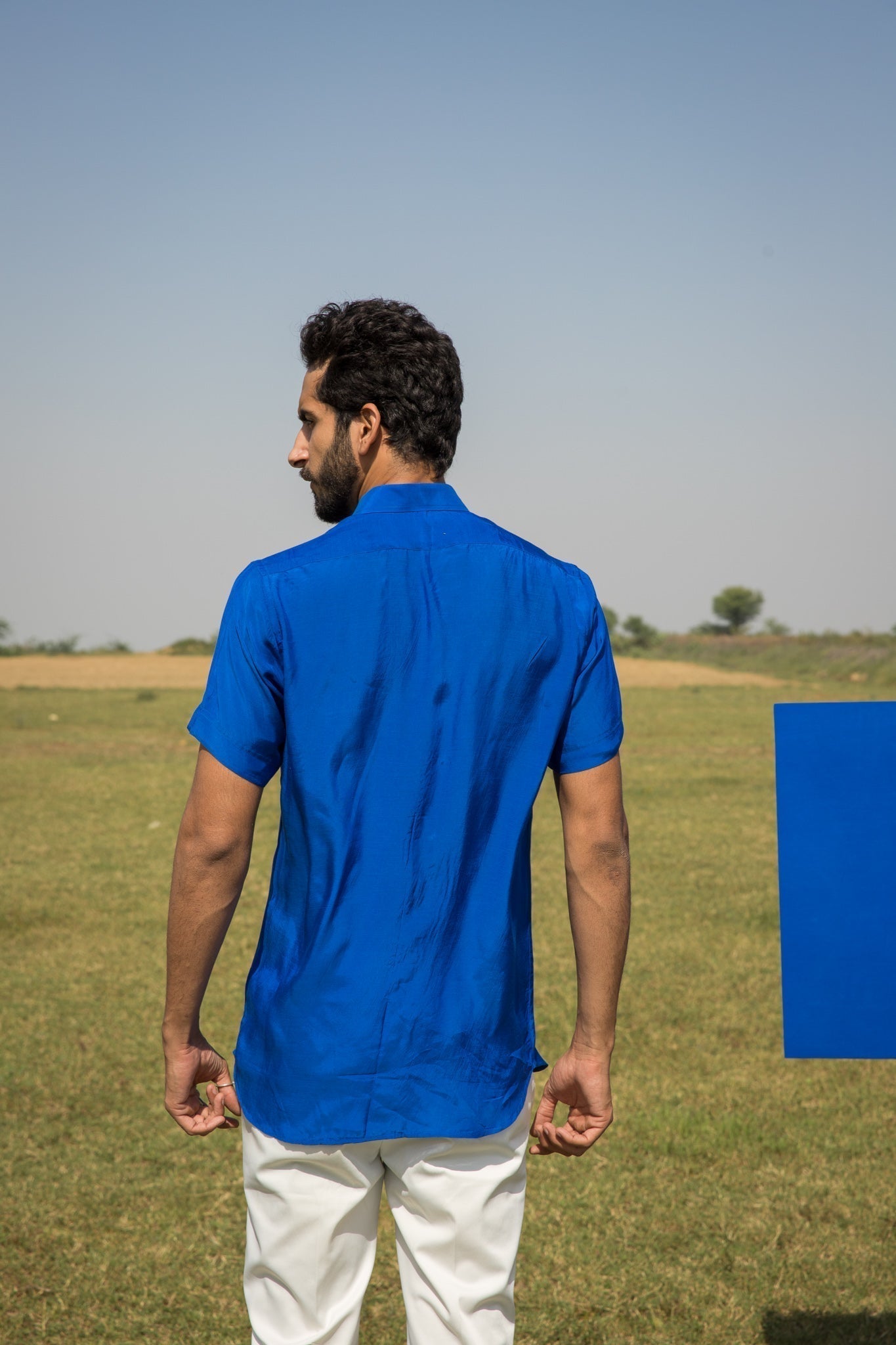 this shirt is crafted in the hue of blue on muslin silk.?ÿ