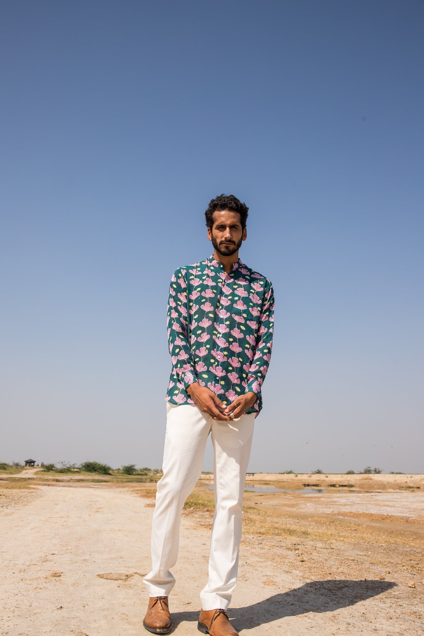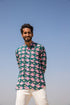 this shirt is crafted in muslin silk hand block printed in our exclusive floral print in hues of green and pink.