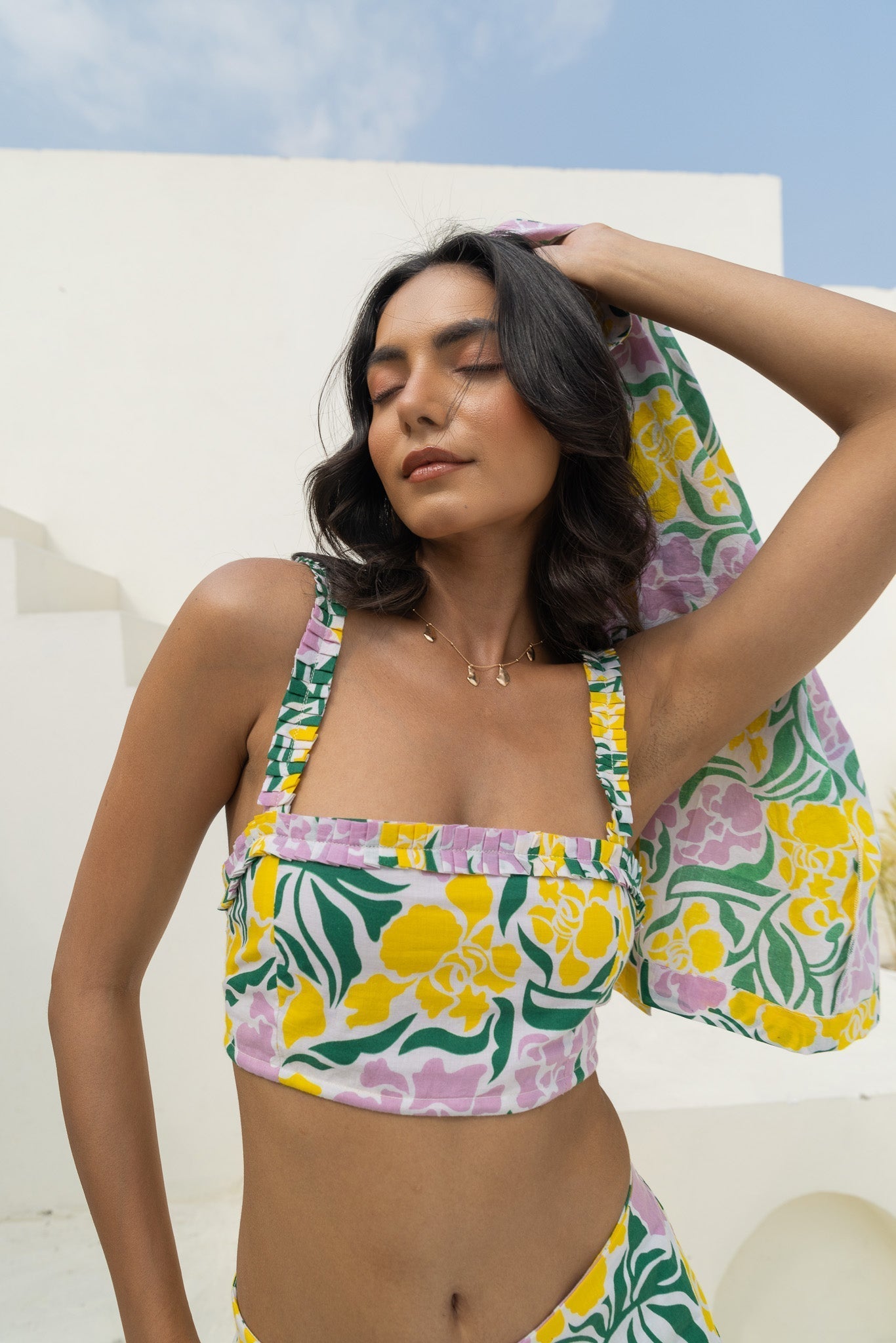 Upgrade your wardrobe with the Sissy Co-Ord Set, a versatile?ÿ3-piece ensemble designed for effortless style. Crafted from soft cotton, this set features a hand screen-printed floral design that exudes elegance and charm. feeling cool, confident, and effortlessly chic all day long. The co-ord features a cropped bustier, relaxed fit shorts, and an oversized shirt, making it a versatile addition to your wardrobe.