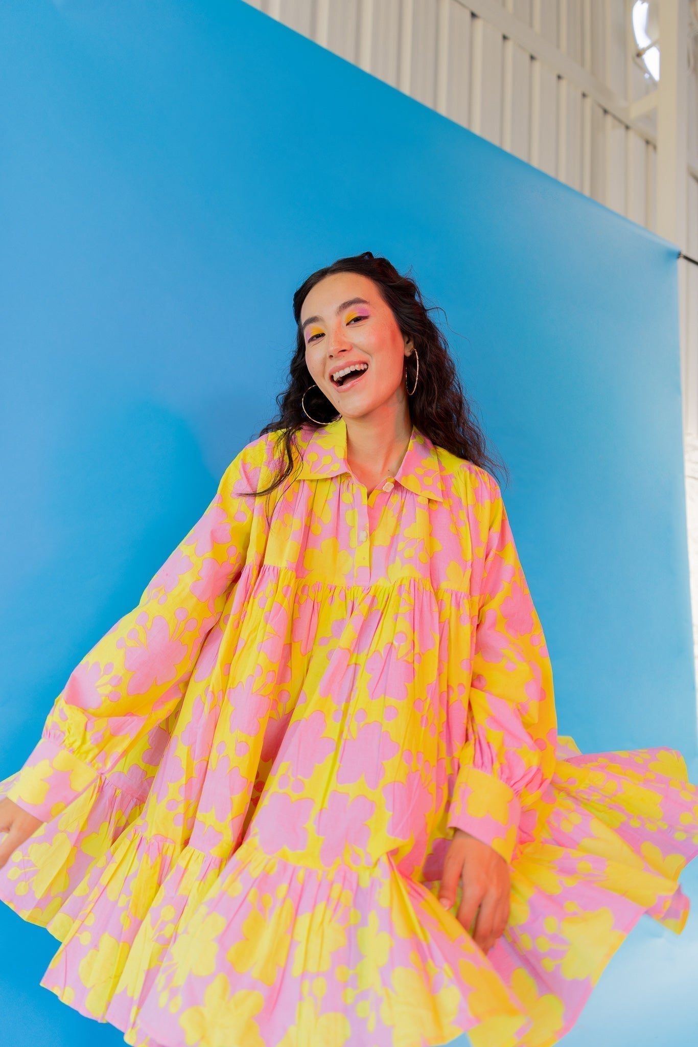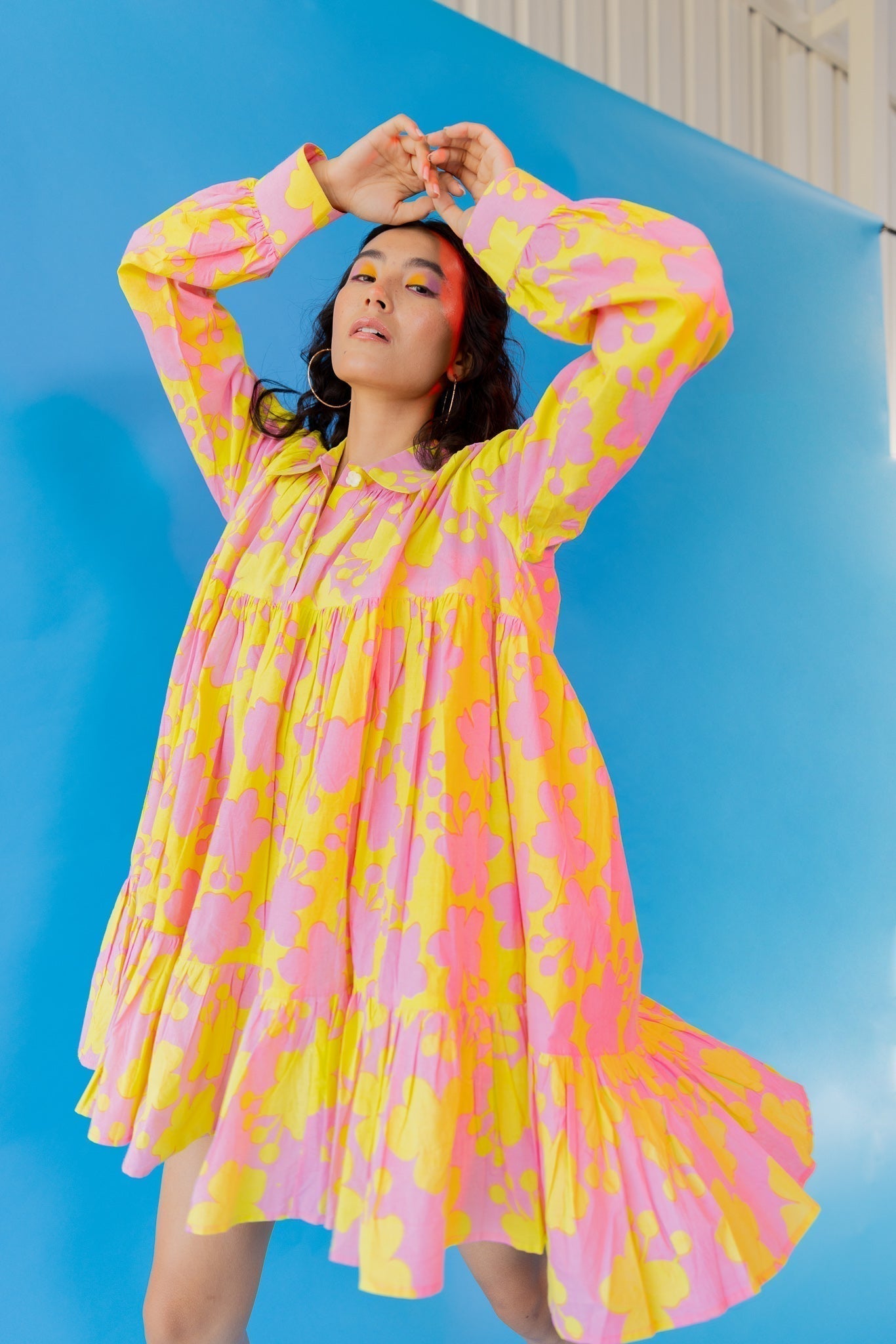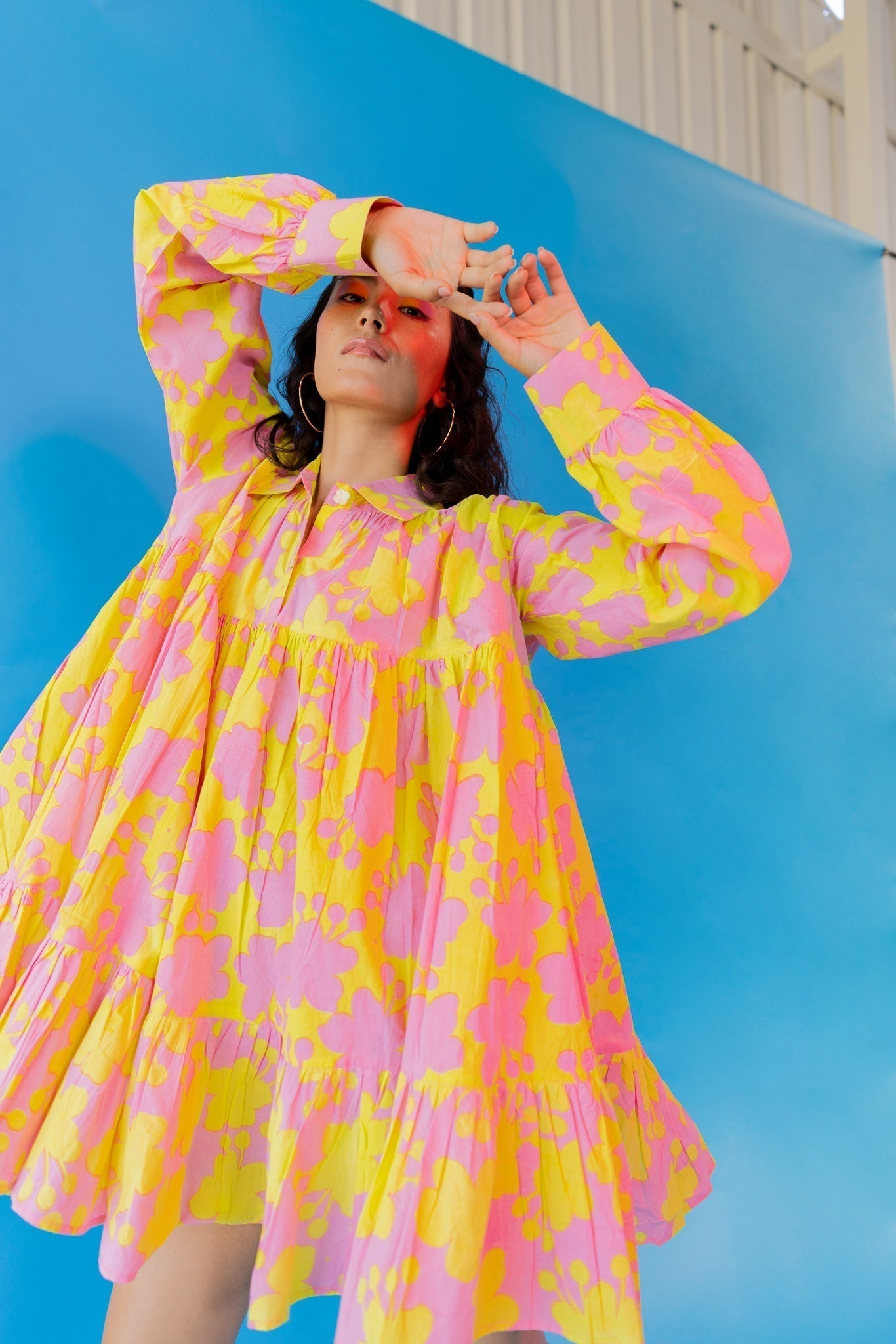 This dress is crafted in our exclusive floral print featuring 3 layers of ruffles to give you extra of everything and full sleeves in pure cotton in the new shades of yellow and pink.?ÿ