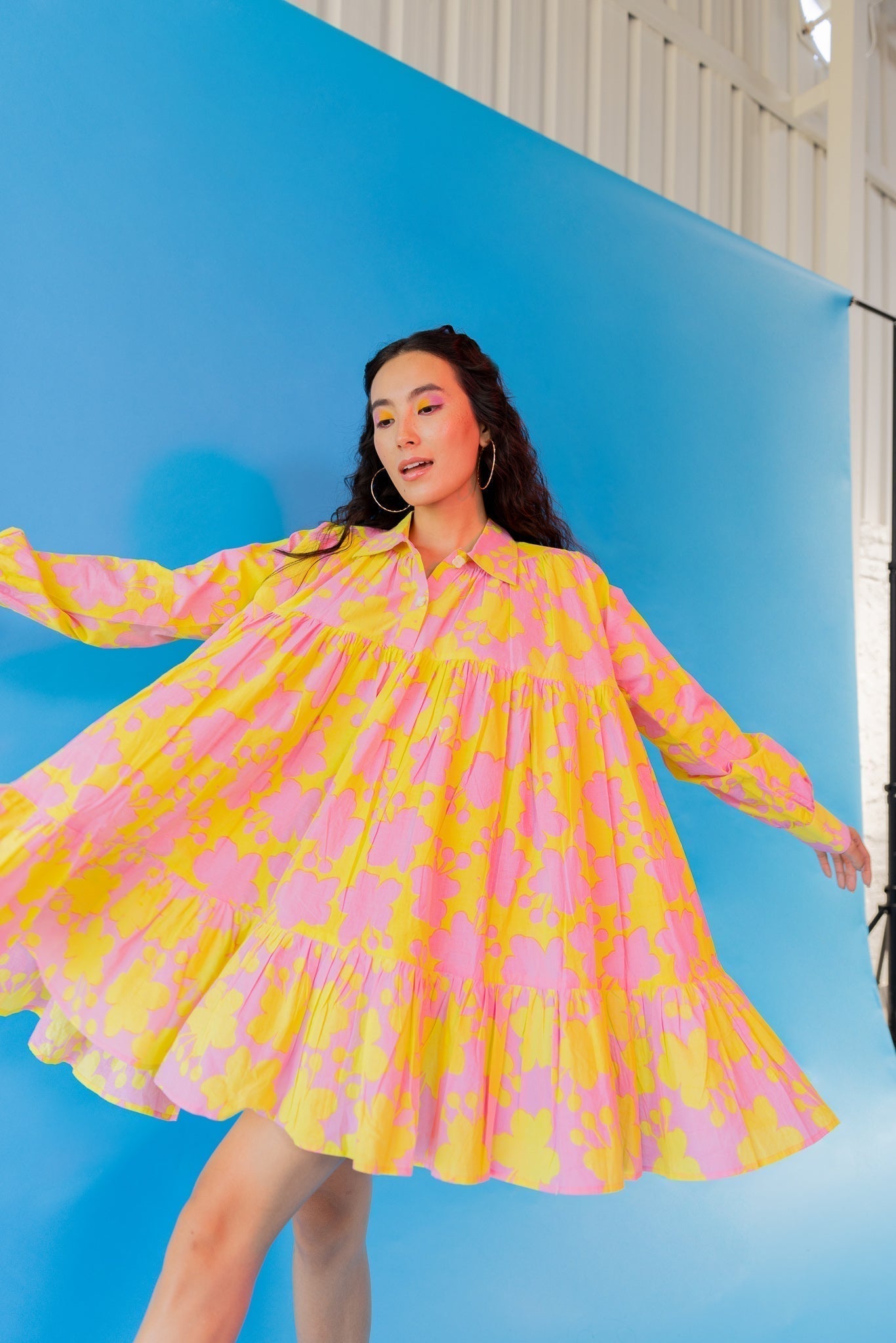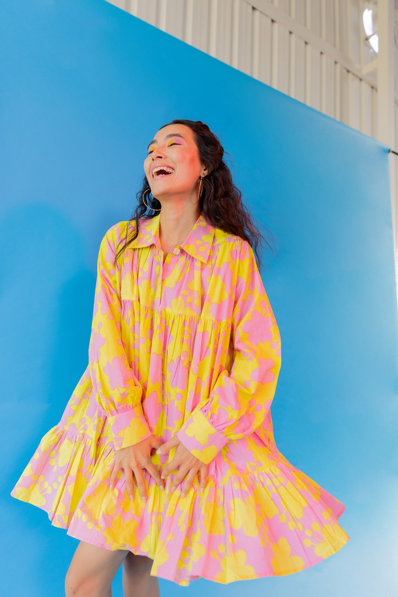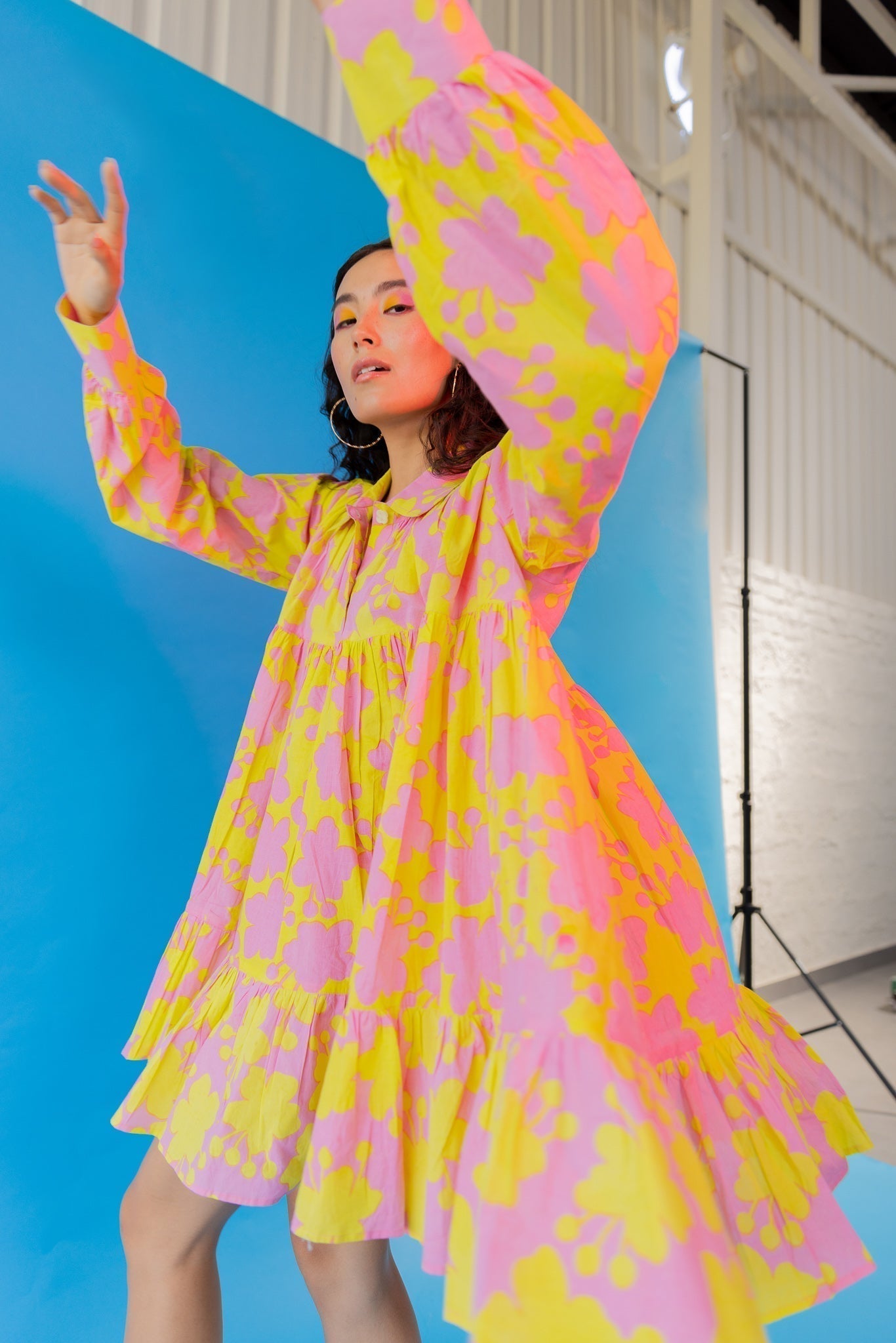 This dress is crafted in our exclusive floral print featuring 3 layers of ruffles to give you extra of everything and full sleeves in pure cotton in the new shades of yellow and pink.?ÿ