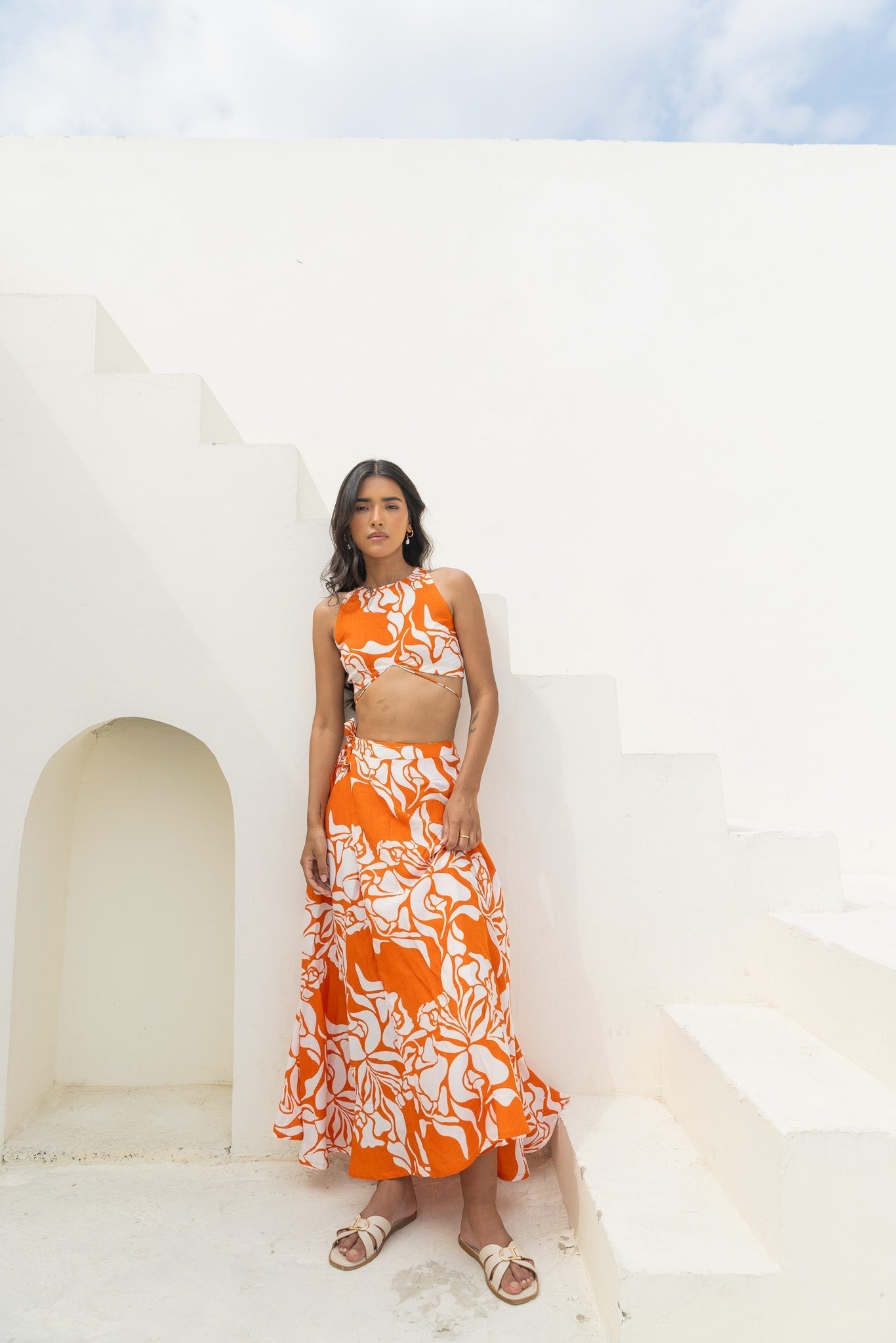 Step into the spotlight with the Golden Hour Co-Ord Skirt Set, a vibrant and handcrafted ensemble designed for the modern muse. Made from luxurious muslin silk, this hand screen-printed set features a striking abstract swirl pattern in bold orange and white, evoking the warmth of golden hour. With a flattering silhouette and contemporary cut, this outfit blends comfort with high-impact style.