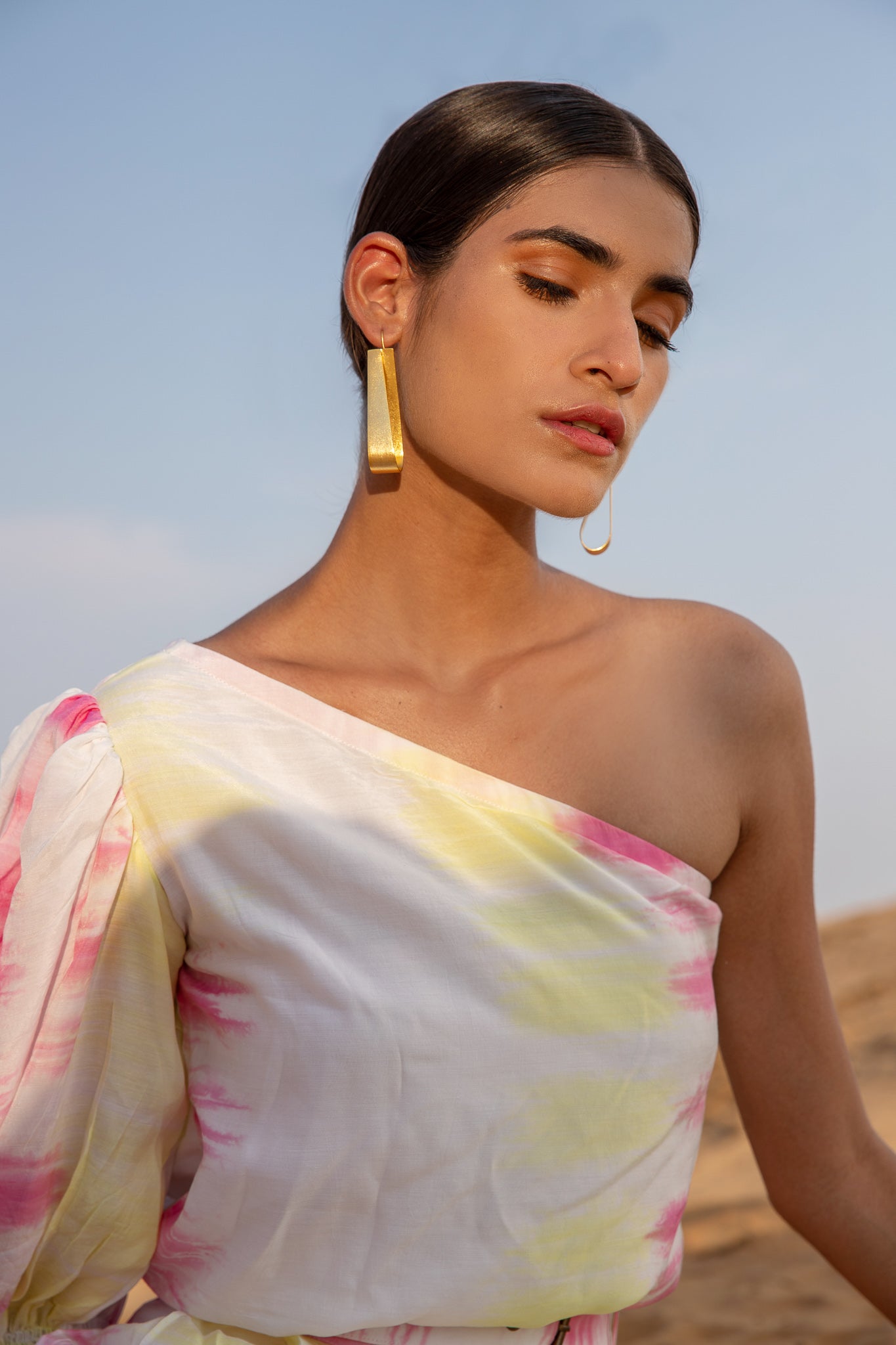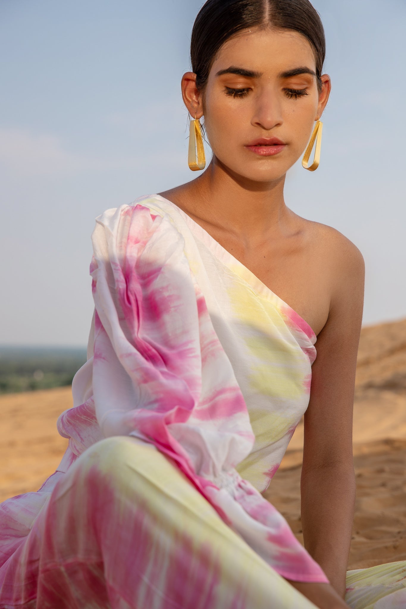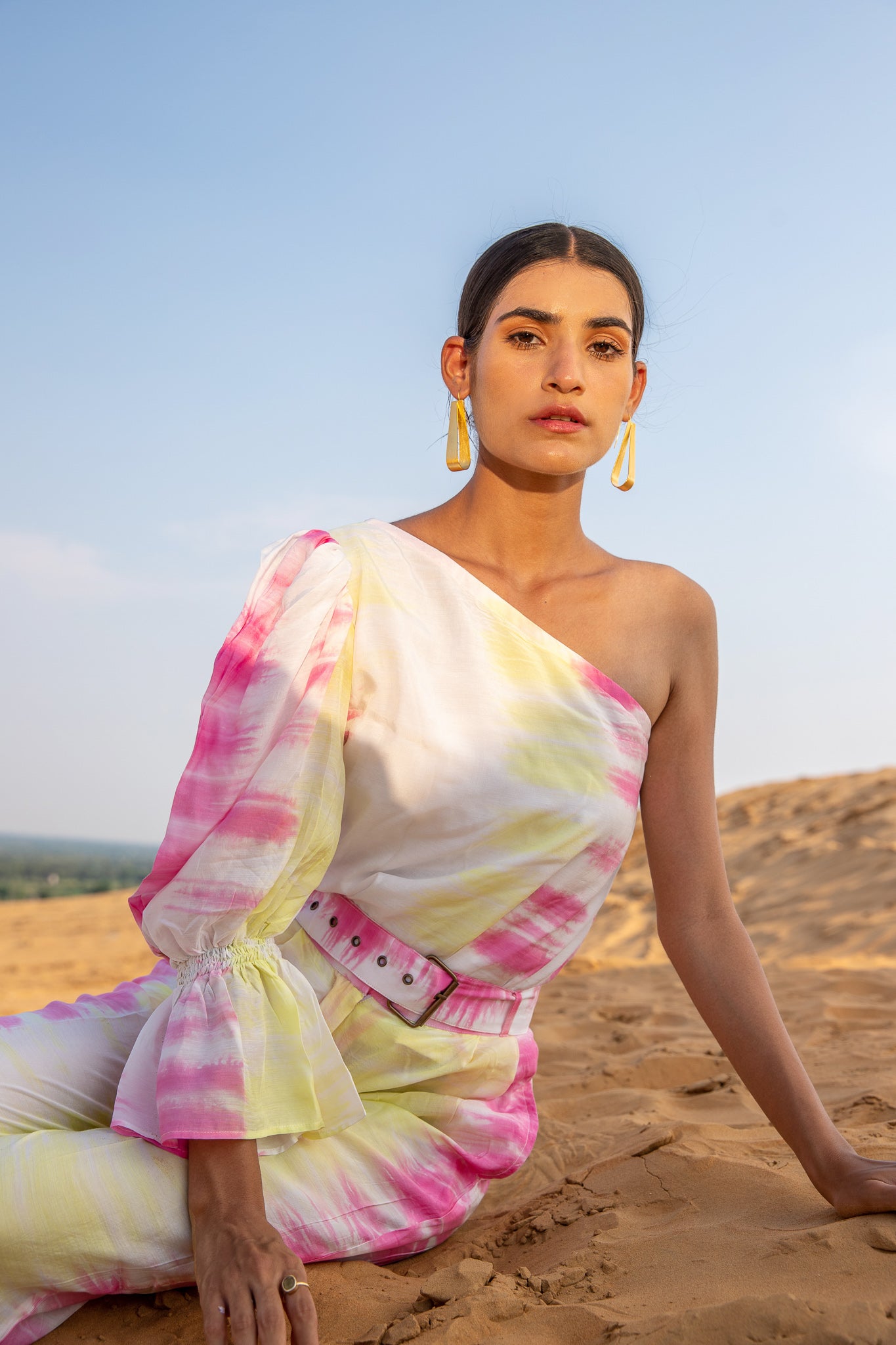 Top it off. Power dressing is the leading trend to own this season. Our Silk Magnolia One-shoulder Co-ord set is tie-dyed by hands in vibrant hues of pink and yellow featuring a one-shoulder top to elevate your day to night style with one generous puffed sleeve. The slim-fit pants have side seam pockets, has a lining, and include a belt.?�??