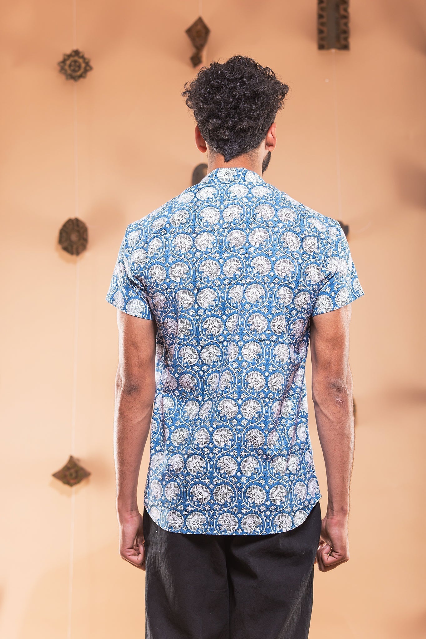 this shirt is made in one of our best selling print, hand block printed in sapphire shade, featuring mandarin collar and regular fit