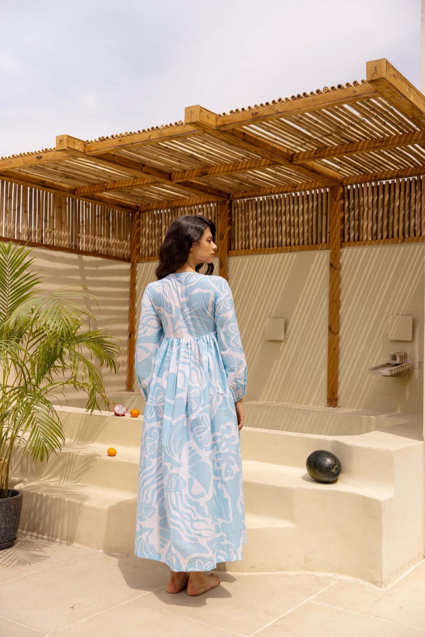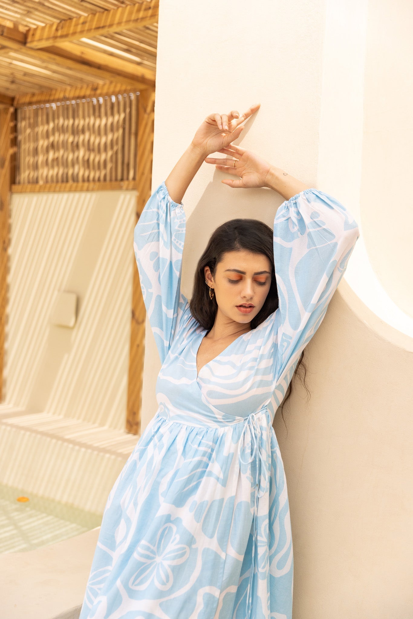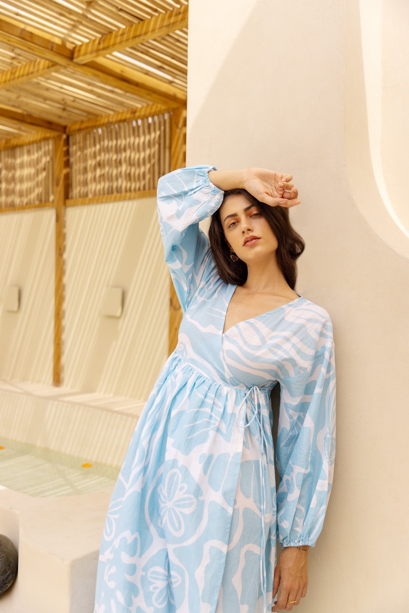 Introducing your new go-to dress for every adventure under the sun! Crafted from pure cotton, it's like a gentle hug for your body, ensuring comfort wherever your day takes you. Inspired by the serene elements of the sea, its print captures the essence of wanderlust. With a versatile midi length and wrap style, this dress effortlessly transitions from lunch dates to city strolls on your vacation. Get ready to make every moment memorable in style!