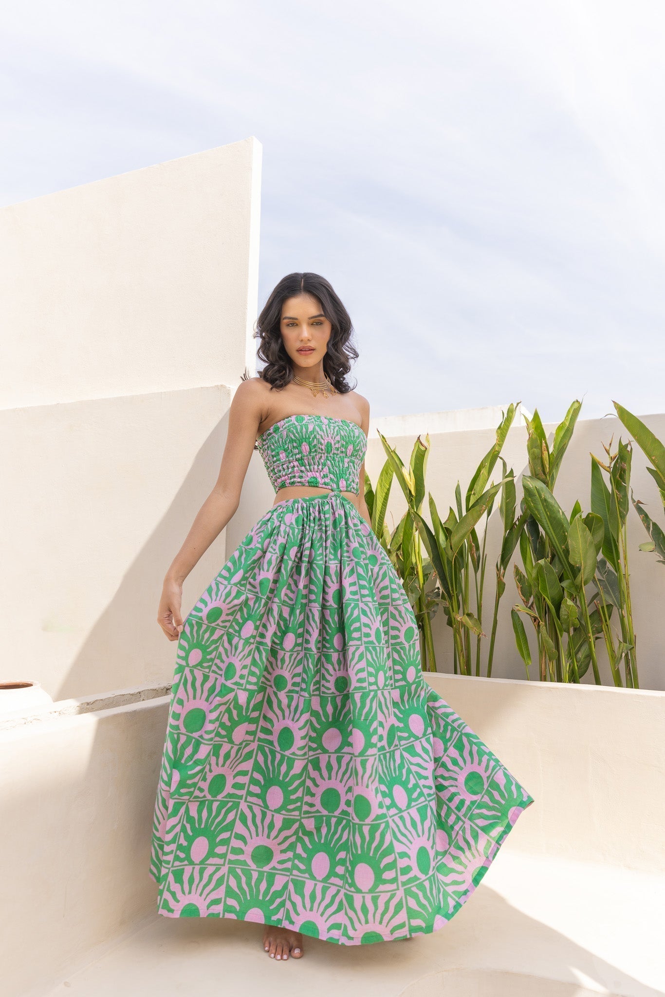 Get ready for sunny days ahead in our handcrafted Sunny Guava Off Shoulder Dress! Made with pure cotton, this maxi dress features stylish smocking on the bodice and a playful cutout in the waist. The hand screen printed exclusive print is inspired by the sun, making it the perfect addition to your vacation wardrobe. Don't miss out on this summer must-have!