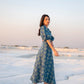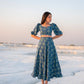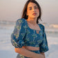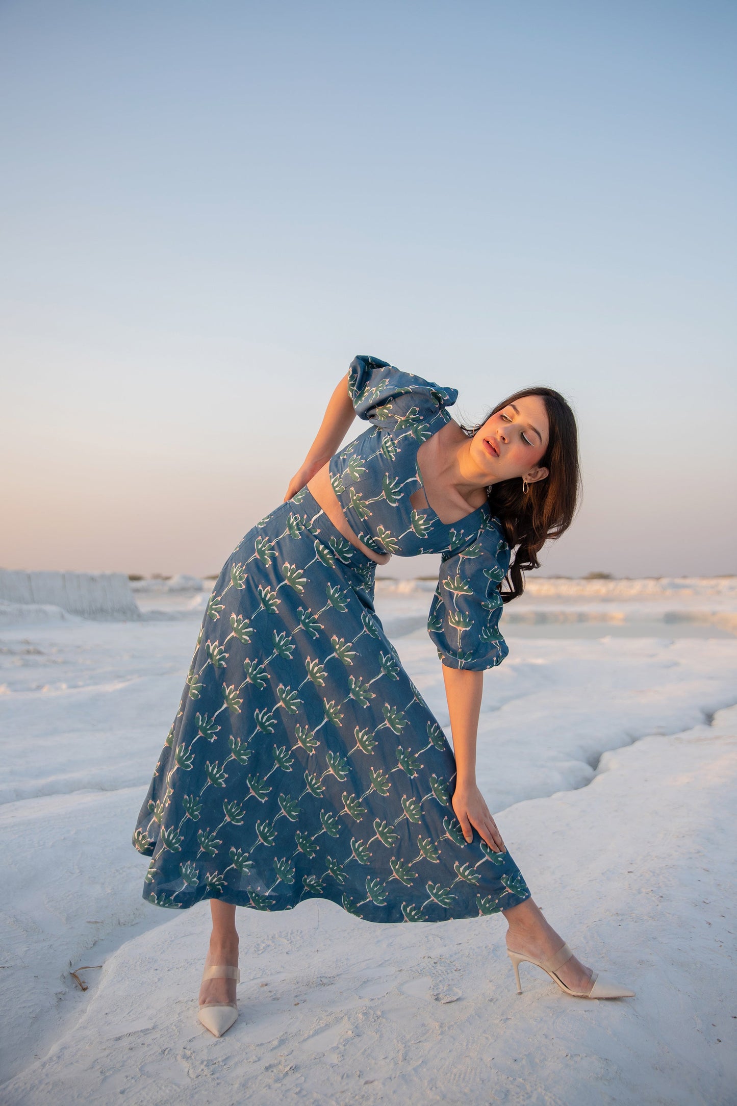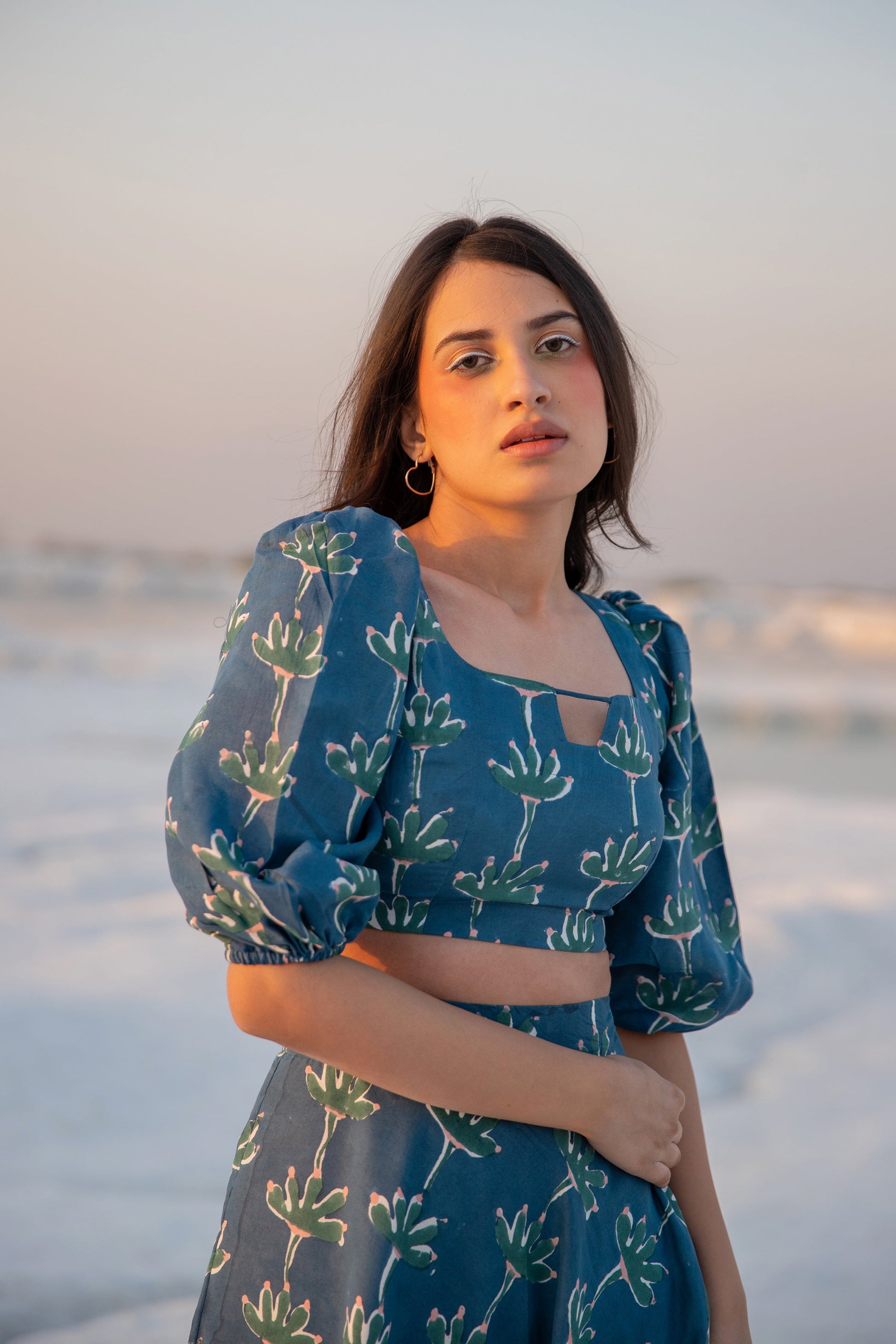 this co-ord set is hand block printed in our exclusive poppy print on silk featuring square notched neckline, puff sleeves and circular midi length skirt