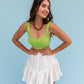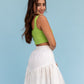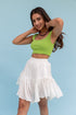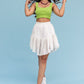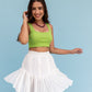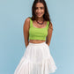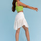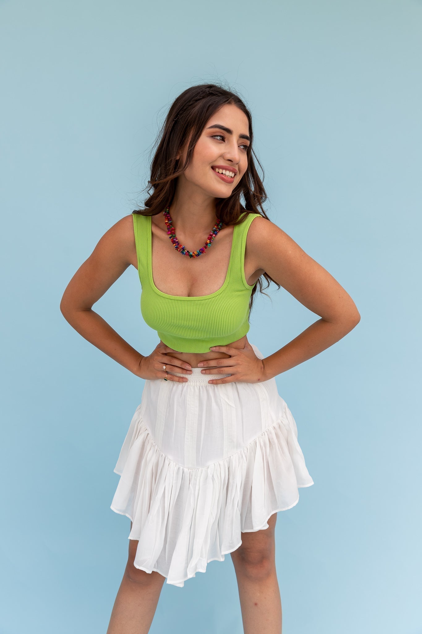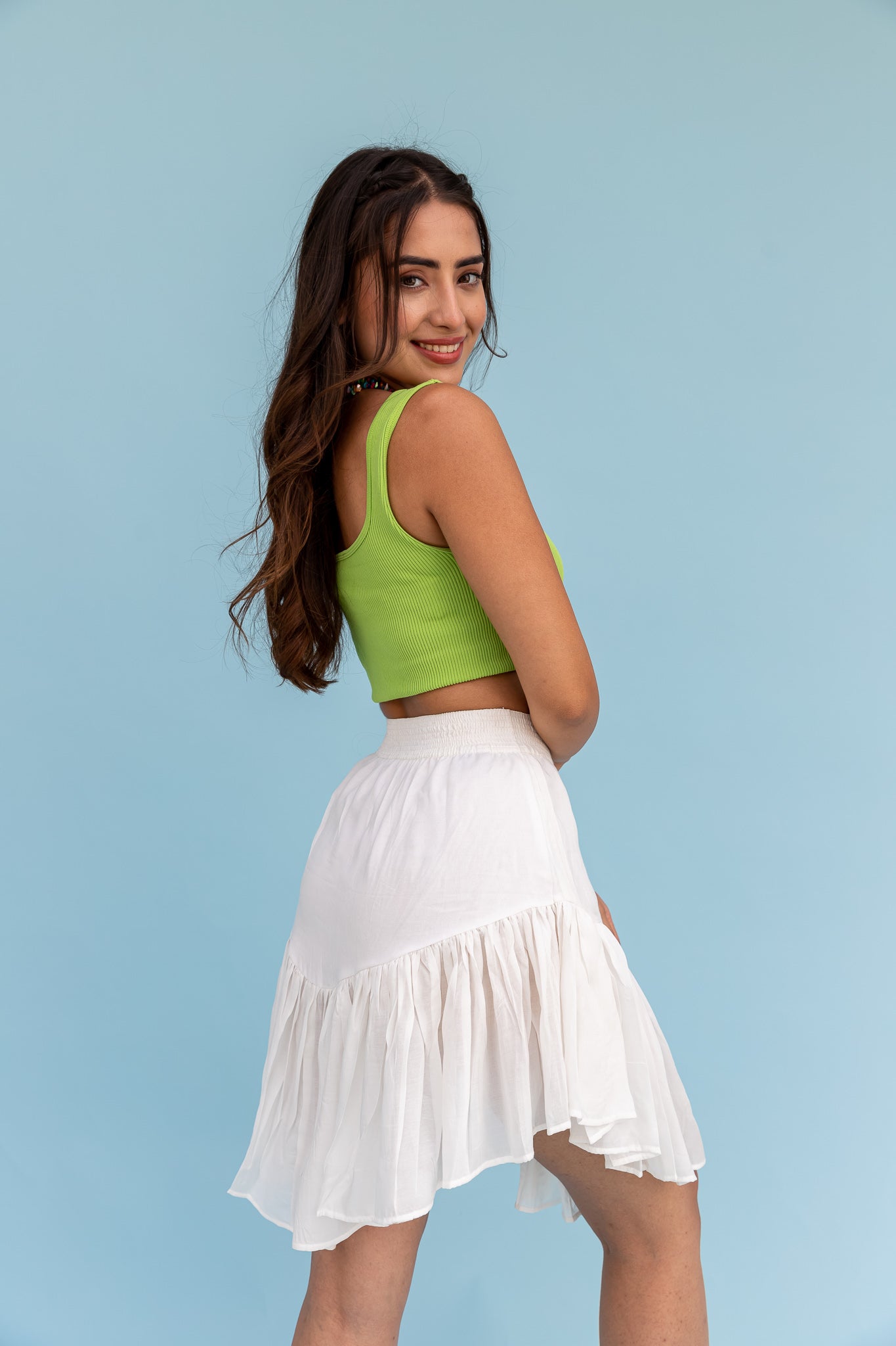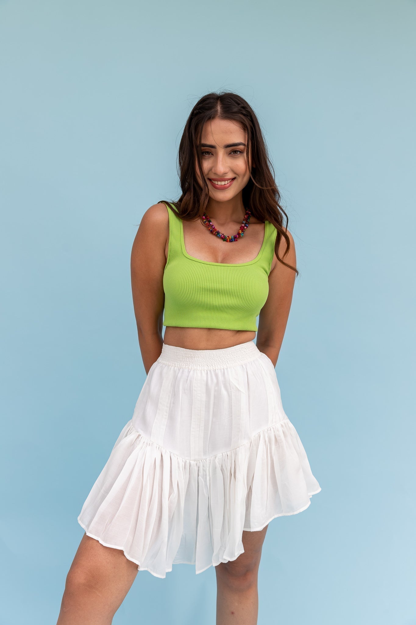 Our Pearl Mini Skirt is a new fav in a mix of flare and pintucks detailing. This slip-on mini has a smocking encased waistband, a slim top panel, and a flare at the bottom.