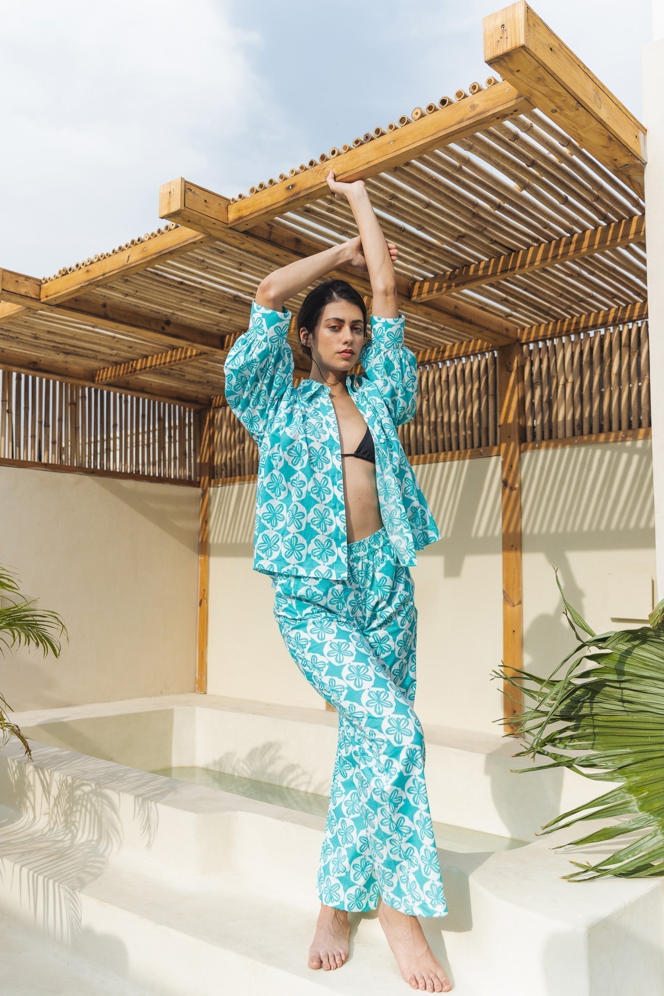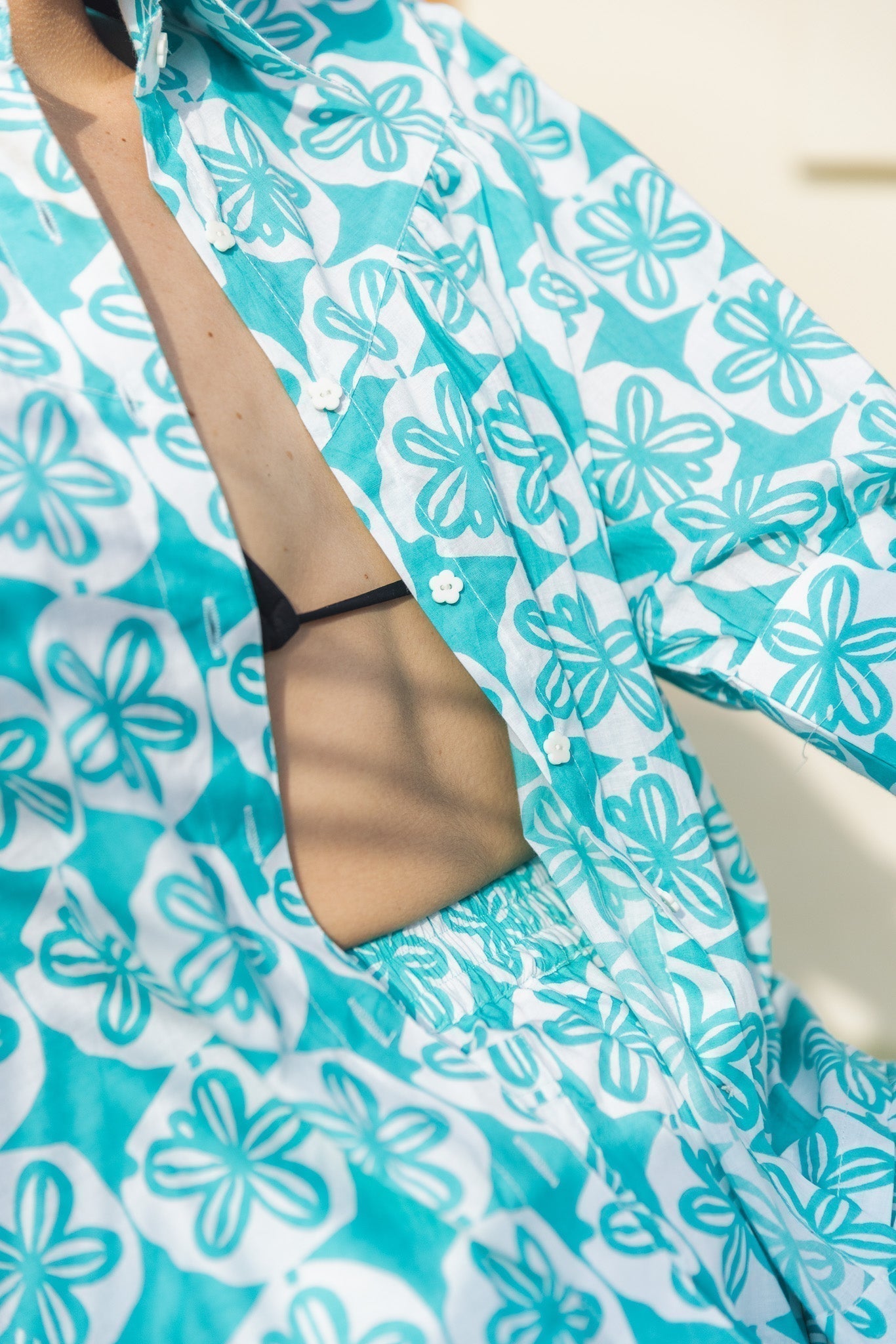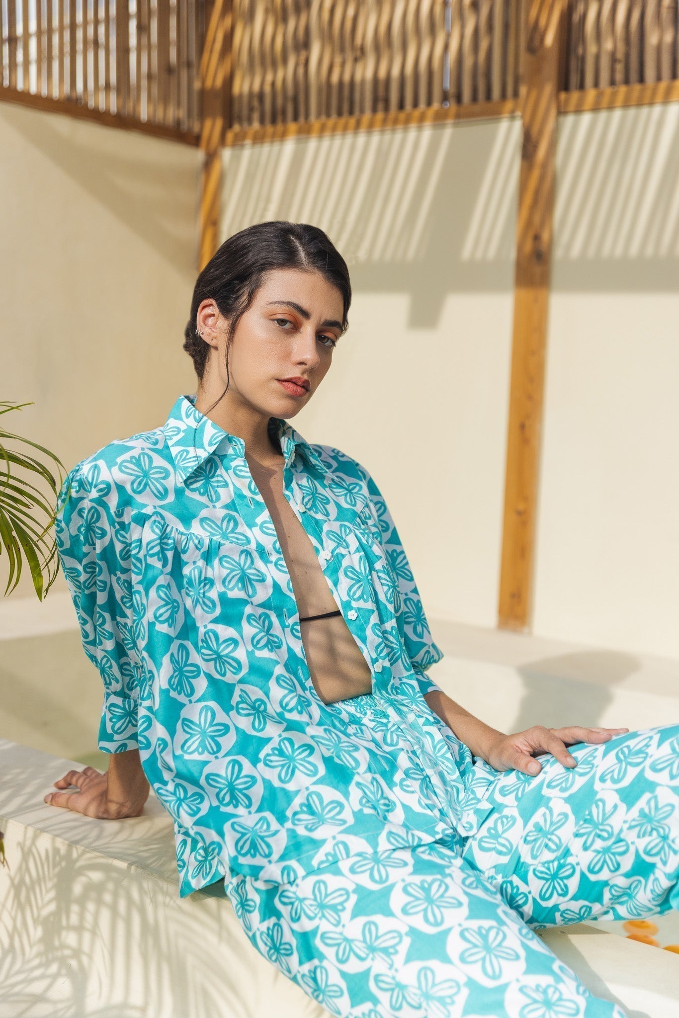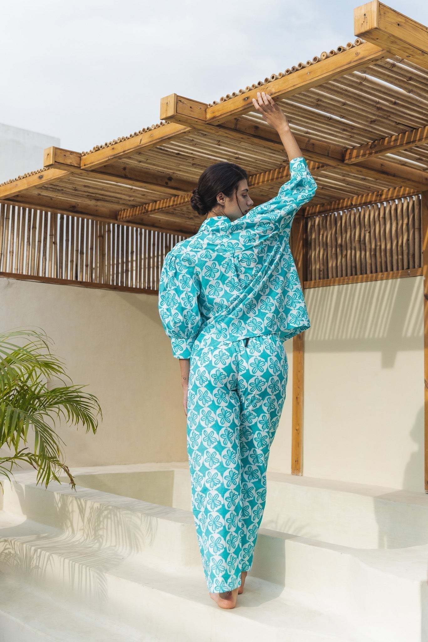 Ride the waves of fashion with our Aqua wonder Co-ord! Made from pure cotton, this playful set features puff sleeves, a floral buttons, and an elasticated waist for ultimate comfort. Dive into style with the beautiful aqua blue shade. Surf's up!