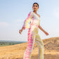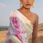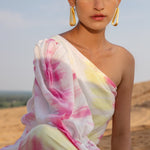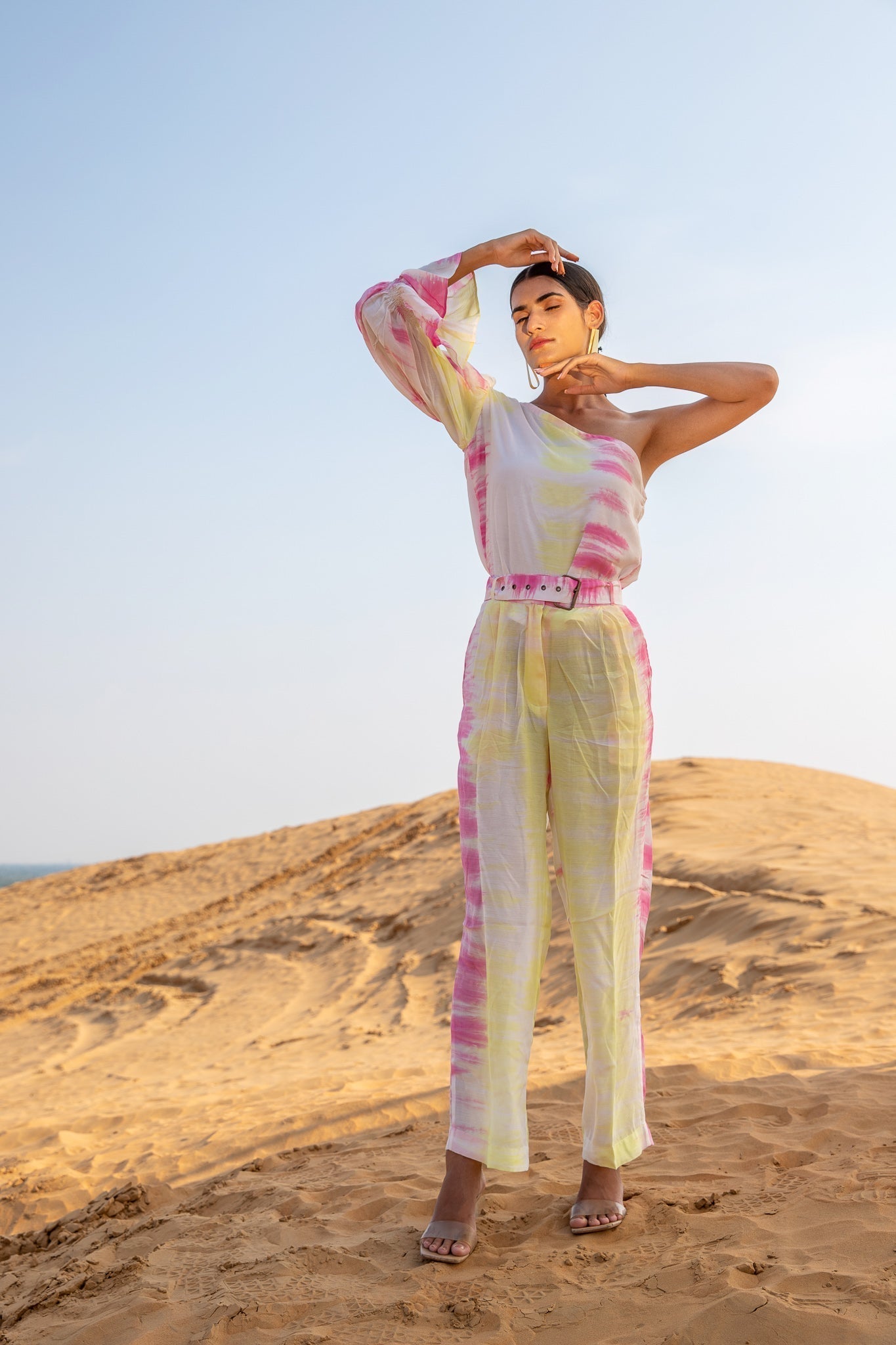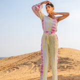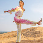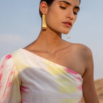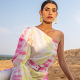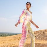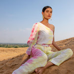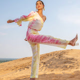 Top it off. Power dressing is the leading trend to own this season. Our Silk Magnolia One-shoulder Co-ord set is tie-dyed by hands in vibrant hues of pink and yellow featuring a one-shoulder top to elevate your day to night style with one generous puffed sleeve. The slim-fit pants have side seam pockets, has a lining, and include a belt.?�??