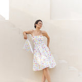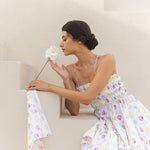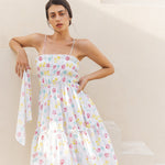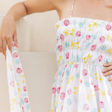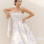 Get ready to spin in style with our Melon Whirl Dress! This cute mini dress features noodle straps, a smocked bodice, and a flared hemline for a flirty fit and flare style. Made with 100% pure cotton in our exclusive print, this dress is both stylish and comfortable.