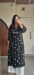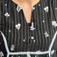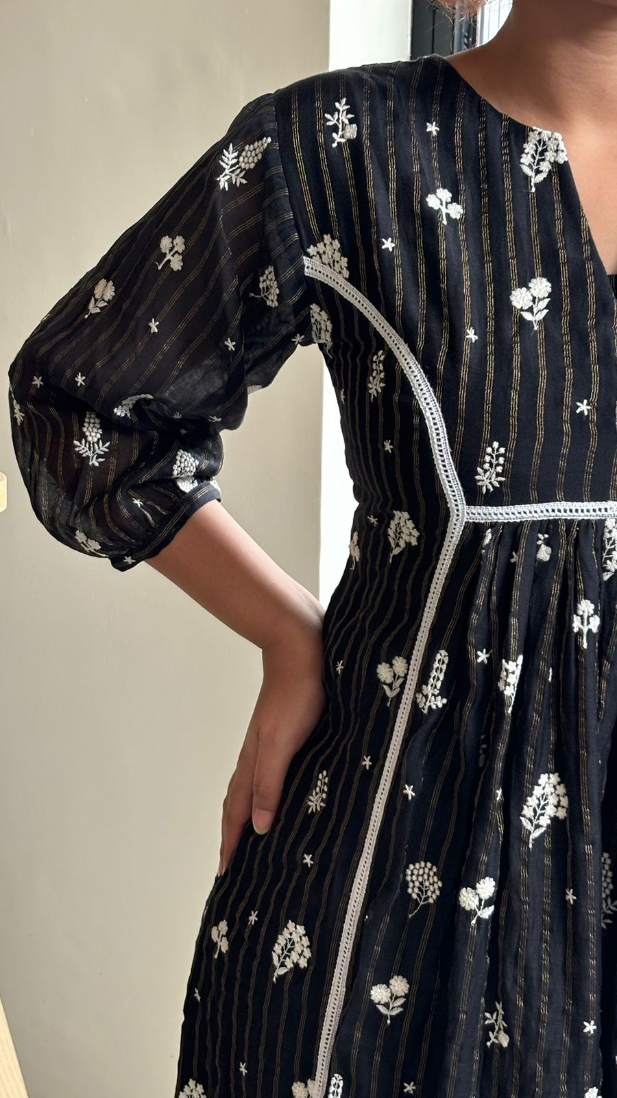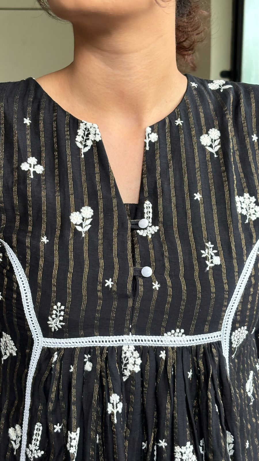 With a flowing gathered silhouette and delicate contrast piping, this black kurta blooms with white florals like stars in the night. A breezy yet statement-making piece — perfect for everyday elegance or twilight strolls