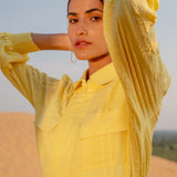 a collared top,?ÿ featuring relaxed blouson sleeves, paneled pockets on both sides, and smocked sleeves in the end.