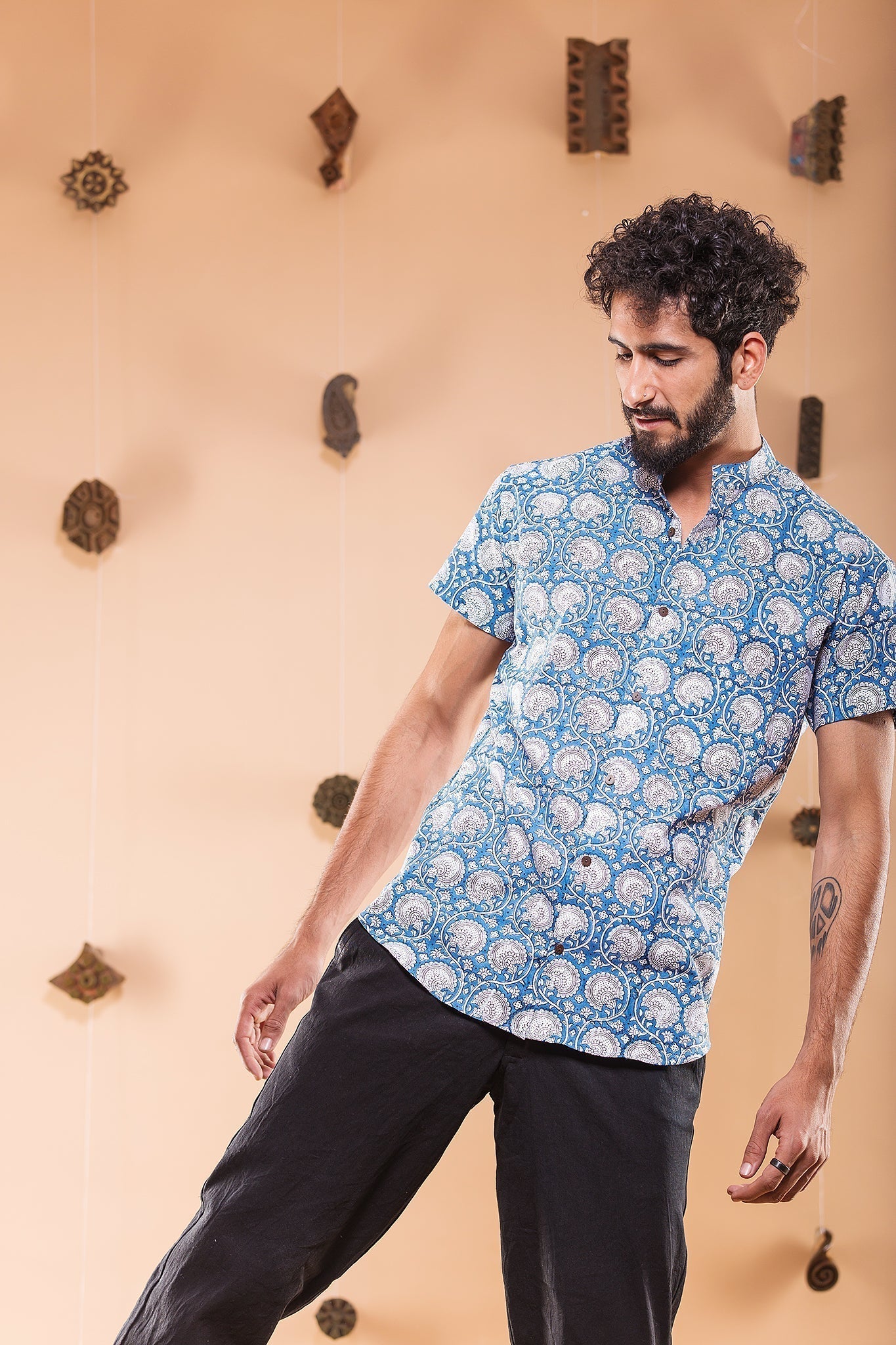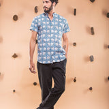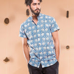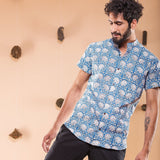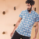 this shirt is made in one of our best selling print, hand block printed in sapphire shade, featuring mandarin collar and regular fit