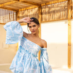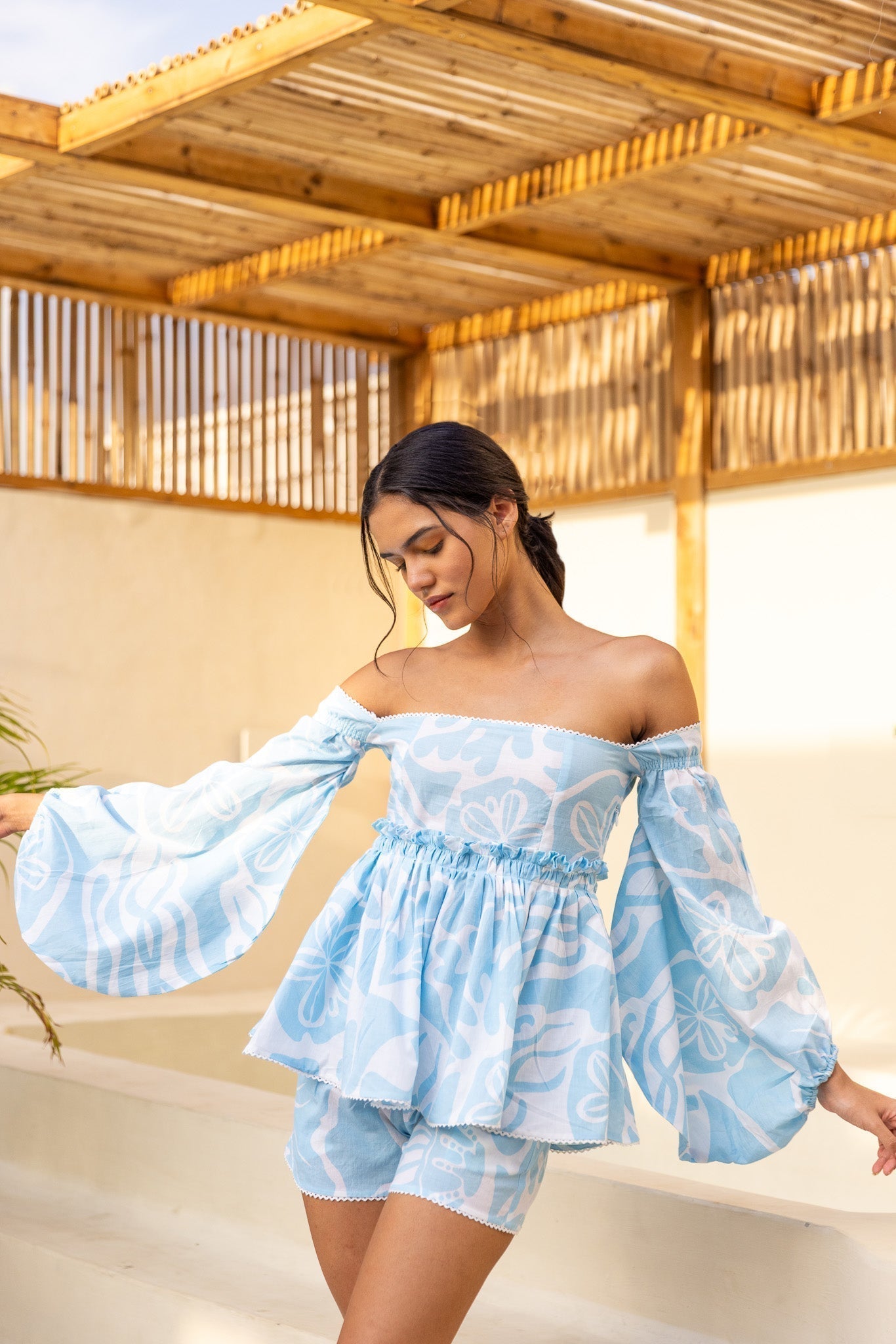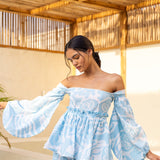 Get ready to shine in style with our Shell Shine Co-ord! The perfect shade of blue on white sets this co-ord apart, featuring an off-the-shoulder top and versatile shorts that can be paired with anything in your wardrobe. The pure cotton fabric and delicate lace detailing add an extra touch of style.